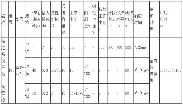 KBT-V3三合一防雷器根據(jù)監(jiān)控系統(tǒng)的特點(diǎn)量身打造的專用防雷設(shè)備,它集電源防雷器、視頻線路防雷器和控制線路防雷器于一體,各部分均采用多級(jí)串聯(lián)式結(jié)構(gòu)設(shè)計(jì),具有多級(jí)保護(hù)功能。適用于公共場(chǎng)所、各種樓宇、機(jī)場(chǎng)、海關(guān)、軍事基地等各種重要安防設(shè)施的室內(nèi)、室外監(jiān)控?cái)z像槍的防雷擊電磁脈沖保護(hù)。三合一防雷器用于帶云臺(tái)攝像槍,安裝在監(jiān)控系統(tǒng)前端的攝像機(jī)尾部,位置與攝像機(jī)越近越好,并做好接地處理,接地電阻應(yīng)符合標(biāo)準(zhǔn)的要求。